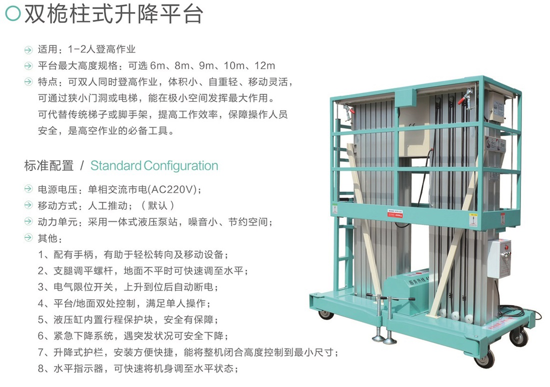 特點:體積小、自重輕、移動靈活,可通過狹小門洞或電梯,能在極小空間發揮最大作用。可代替傳統梯子或腳手架,提高工作效率,保障操作人員安全,是高空作業的必備工具。